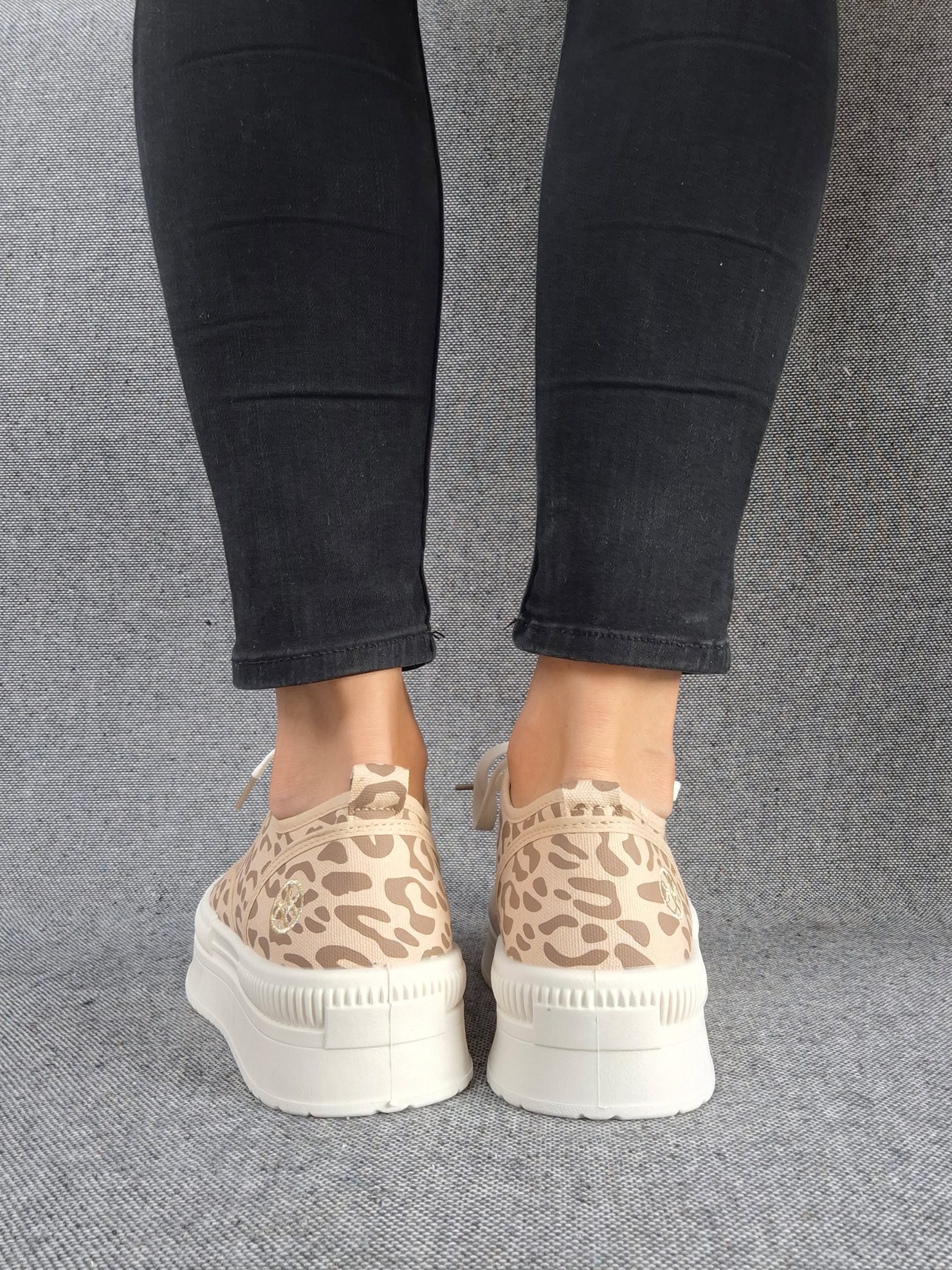 Chaussures baskets à motif léopard marron camel et blanc semelle compensée style converse
