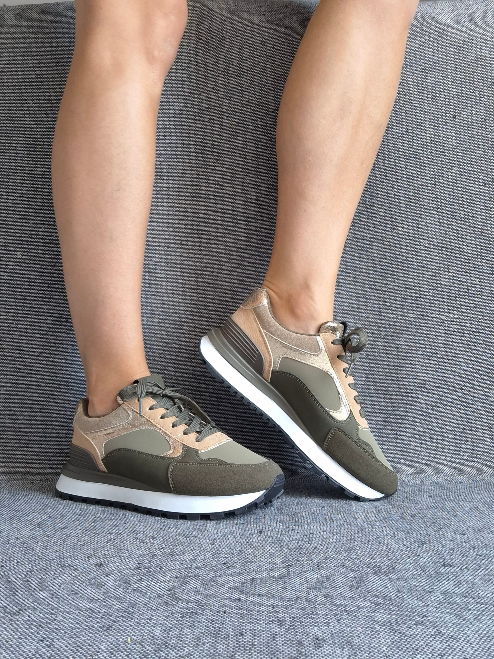 Les baskets présentent un motif léopard beige distinctif qui recouvre la partie supérieure. Elles sont dotées d’une semelle plateforme blanche épaisse avec un design texturé au niveau de la semelle intermédiaire. Les lacets sont blancs, ajoutant un contraste net à l’esthétique globale. Elles ont un look moderne qui attire l’attention et offre un mélange parfait de style et de confort.