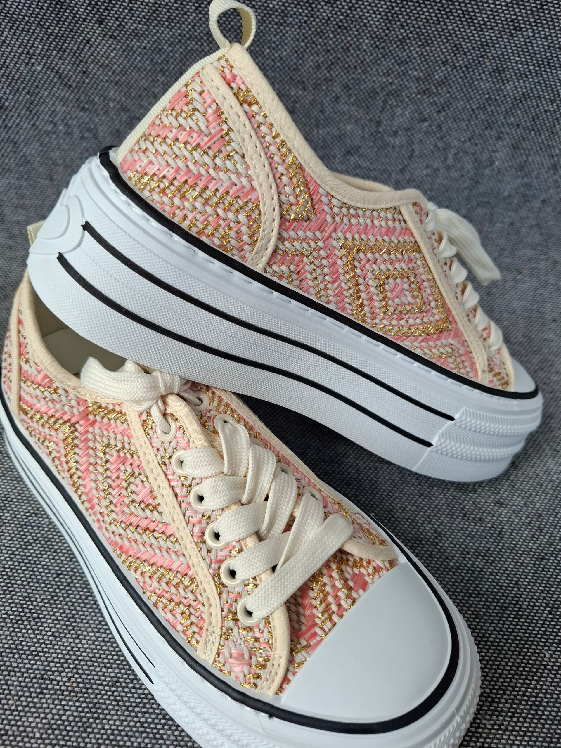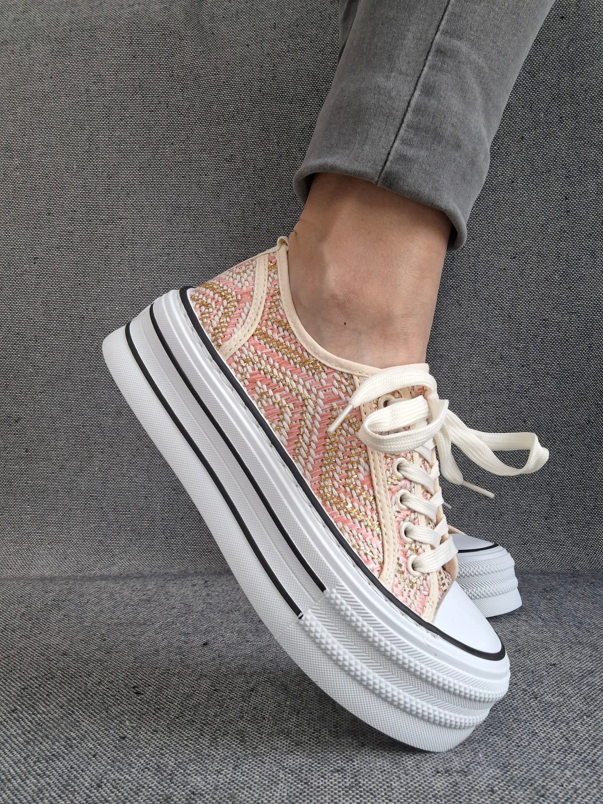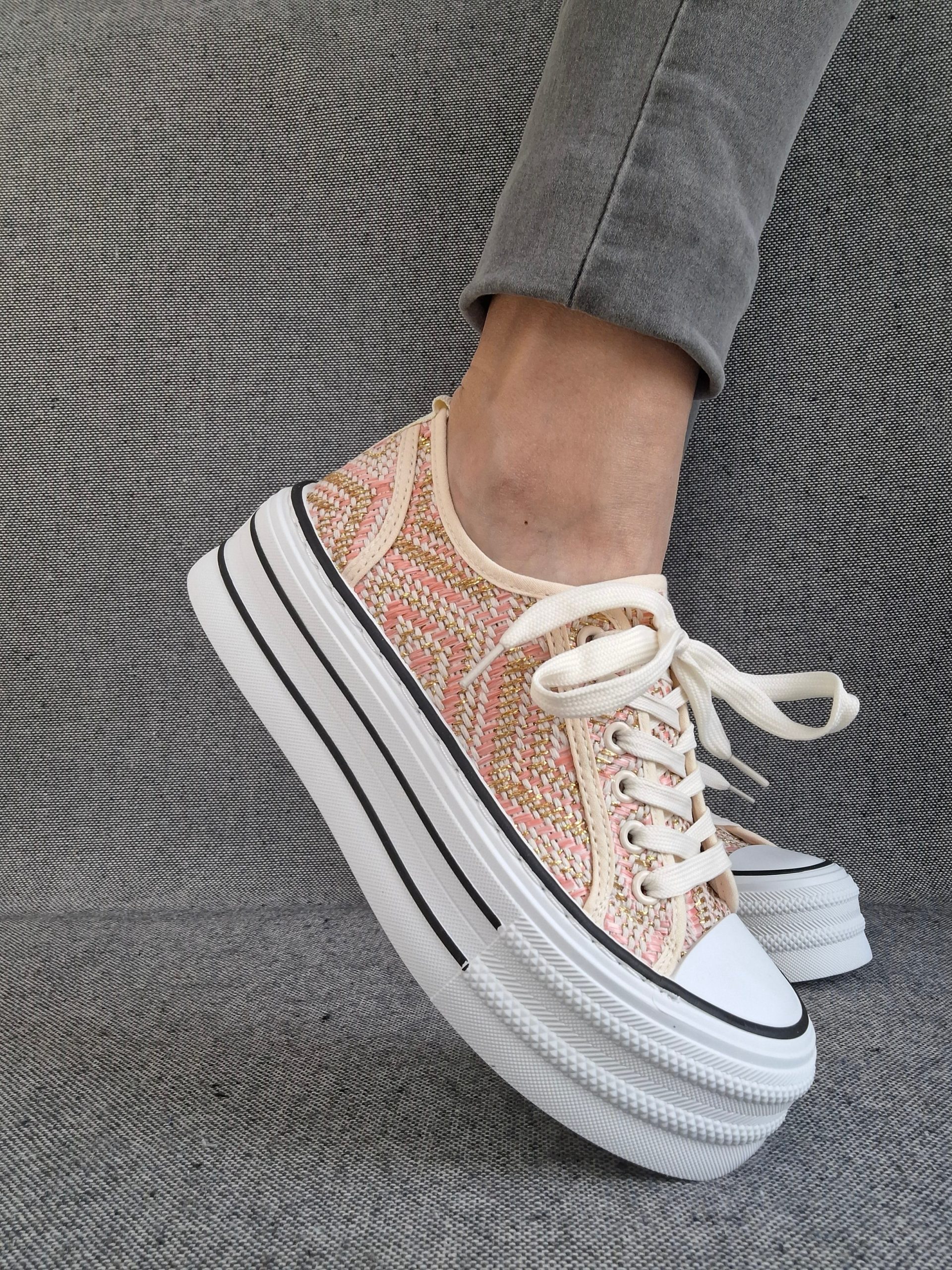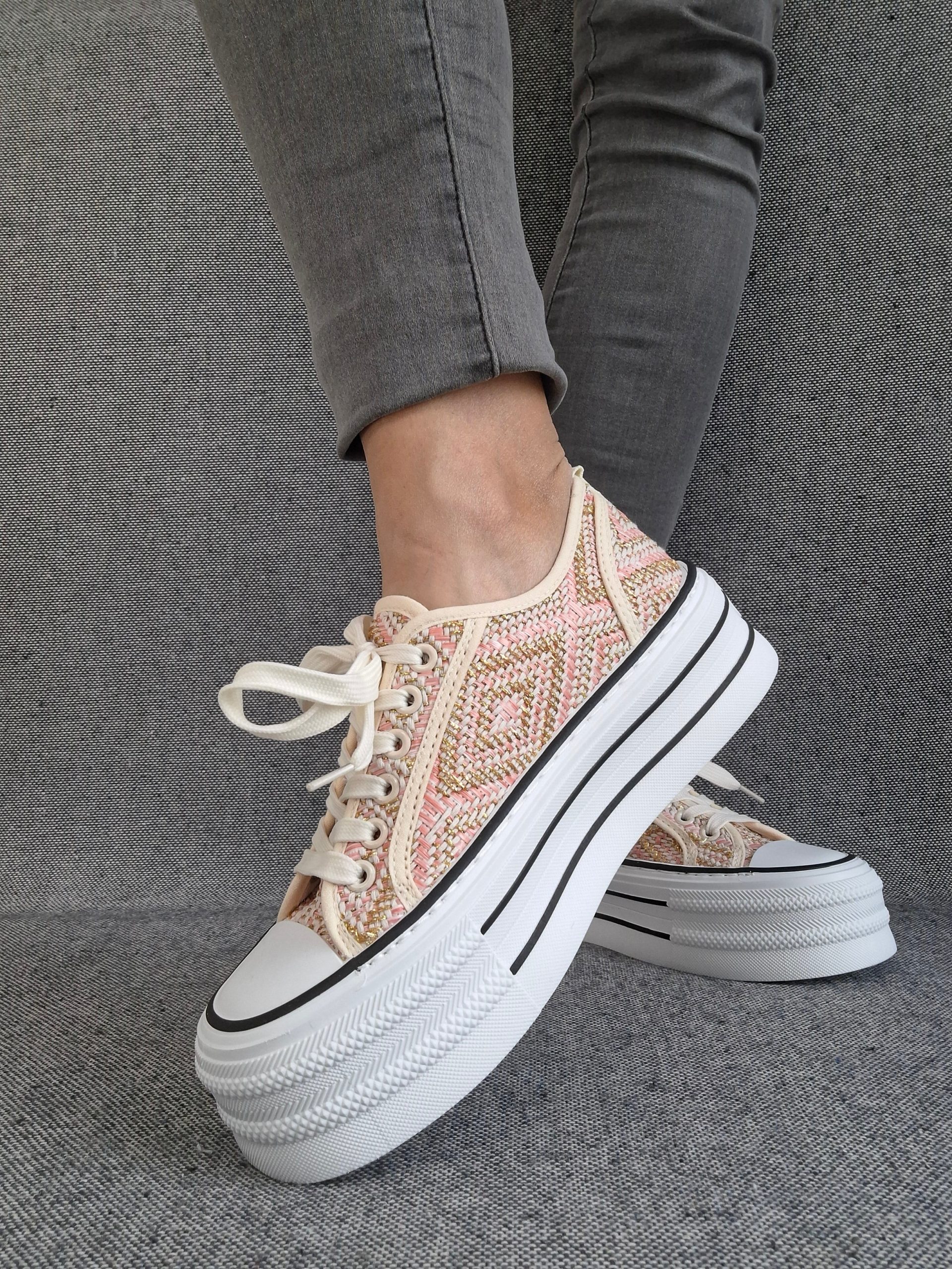 Chaussures baskets effet paille beige rose semelle compensée style converse