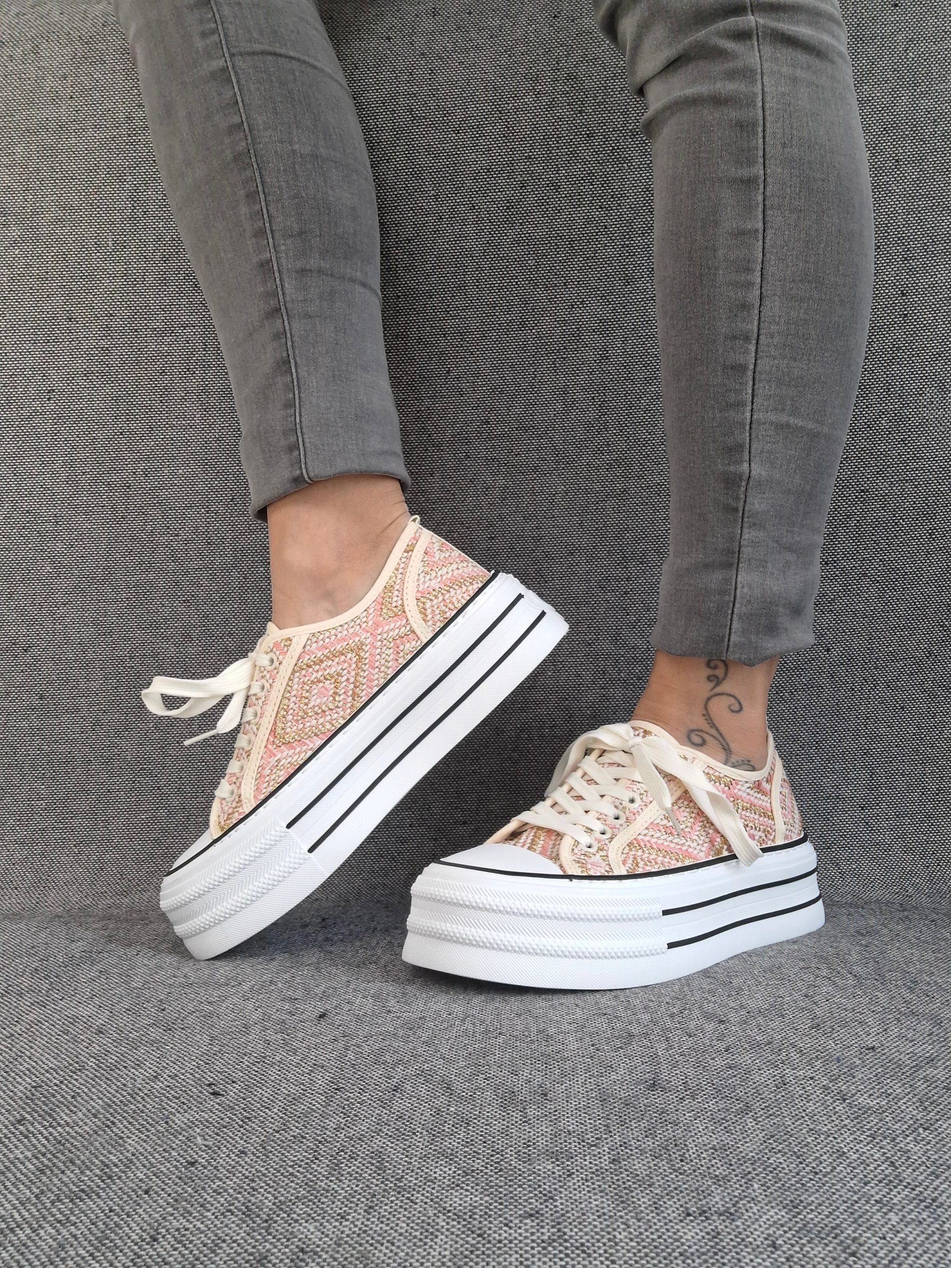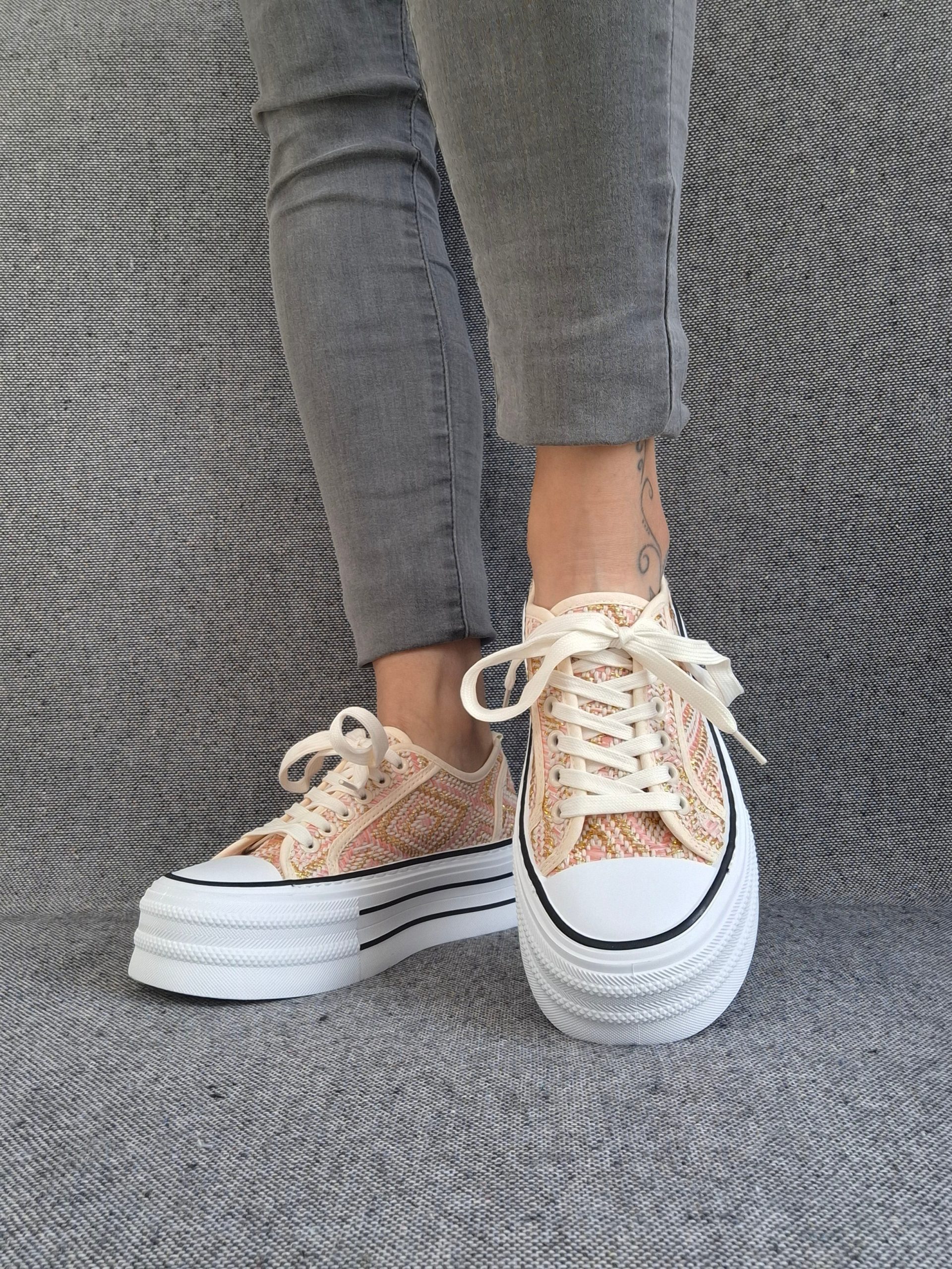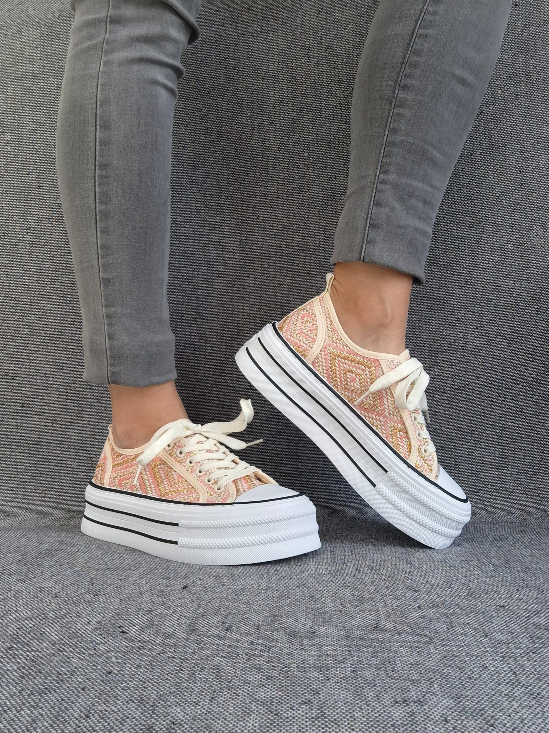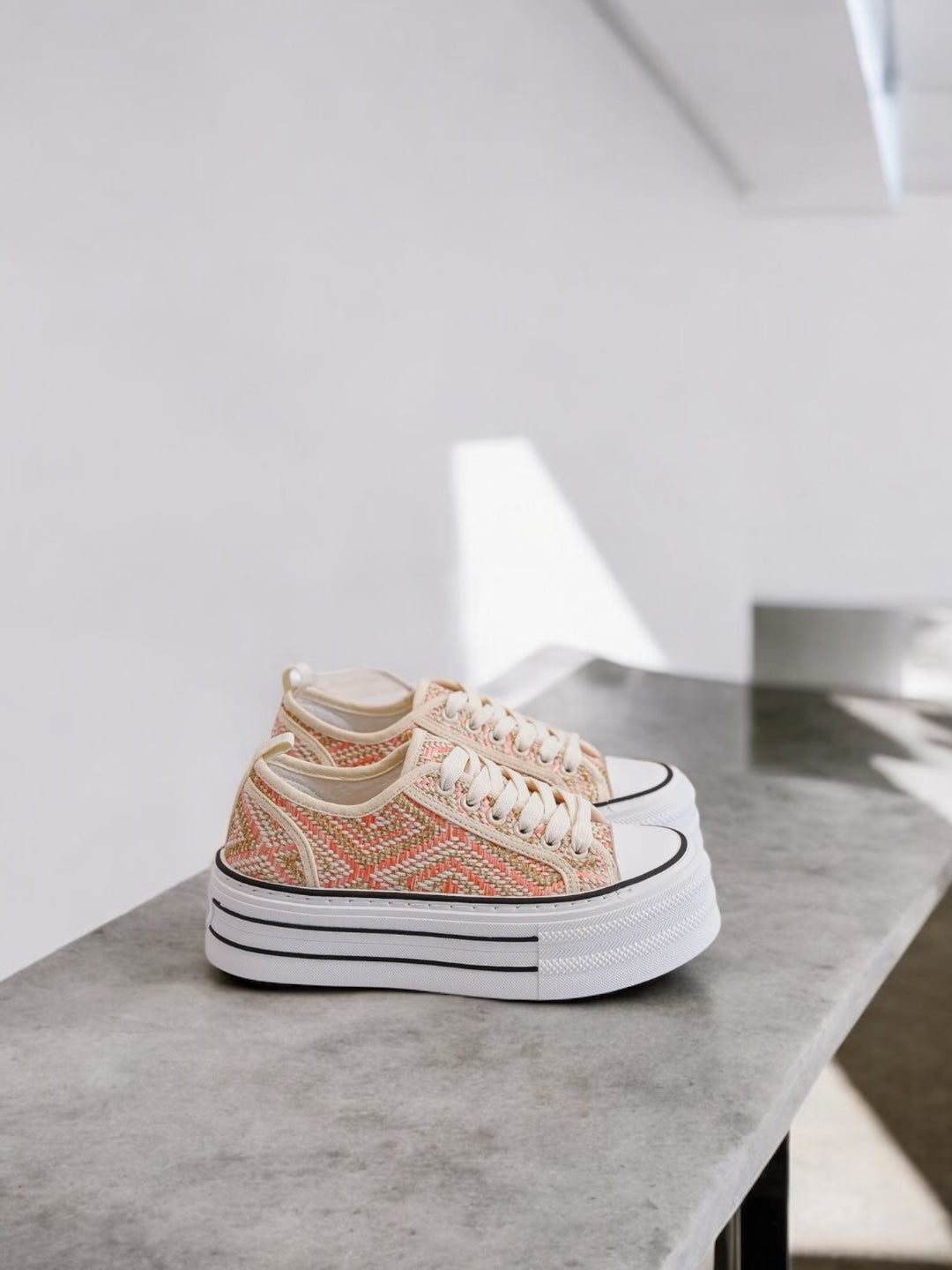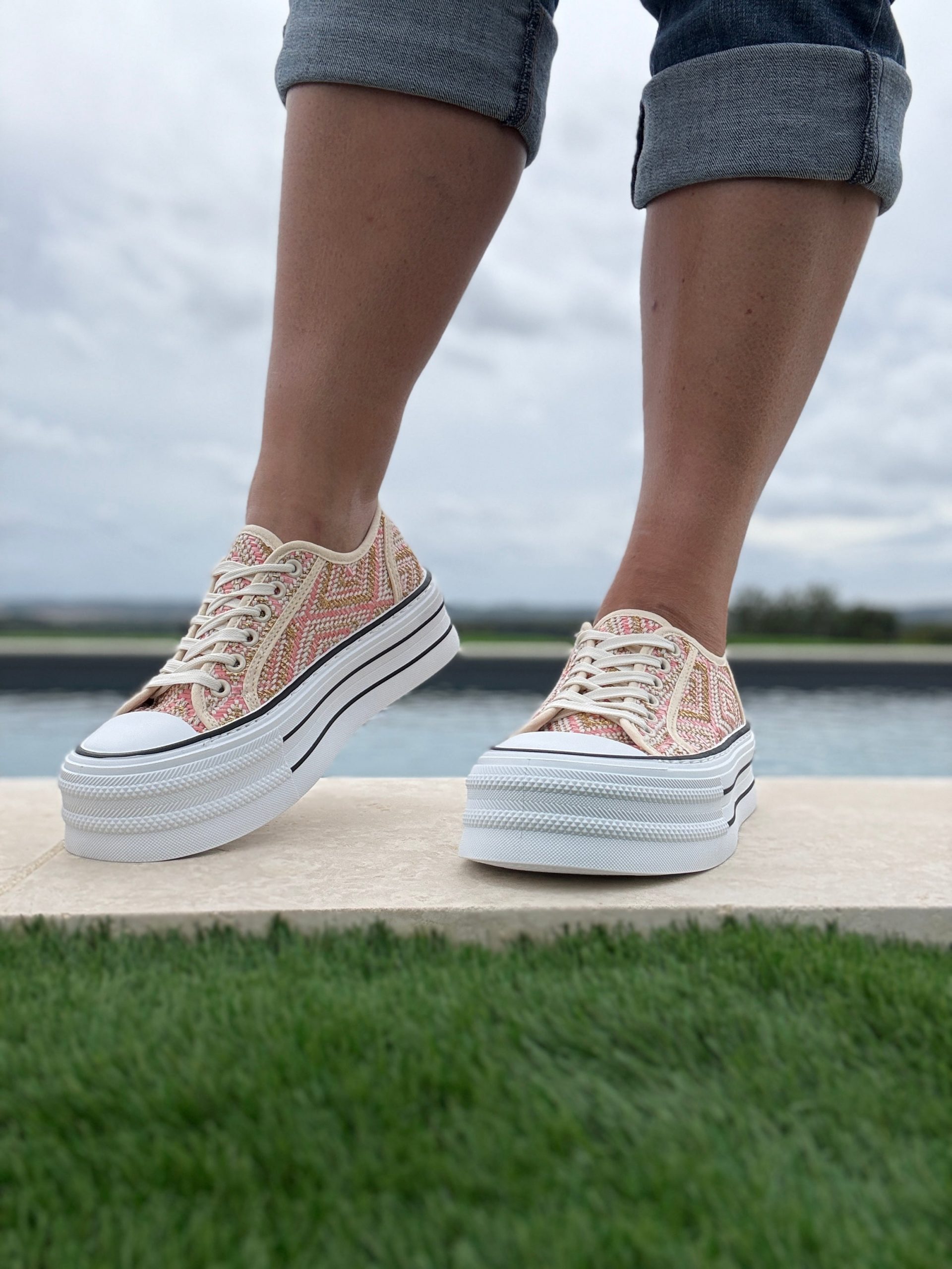Chaussures baskets effet paille beige rose semelle compensée style converse