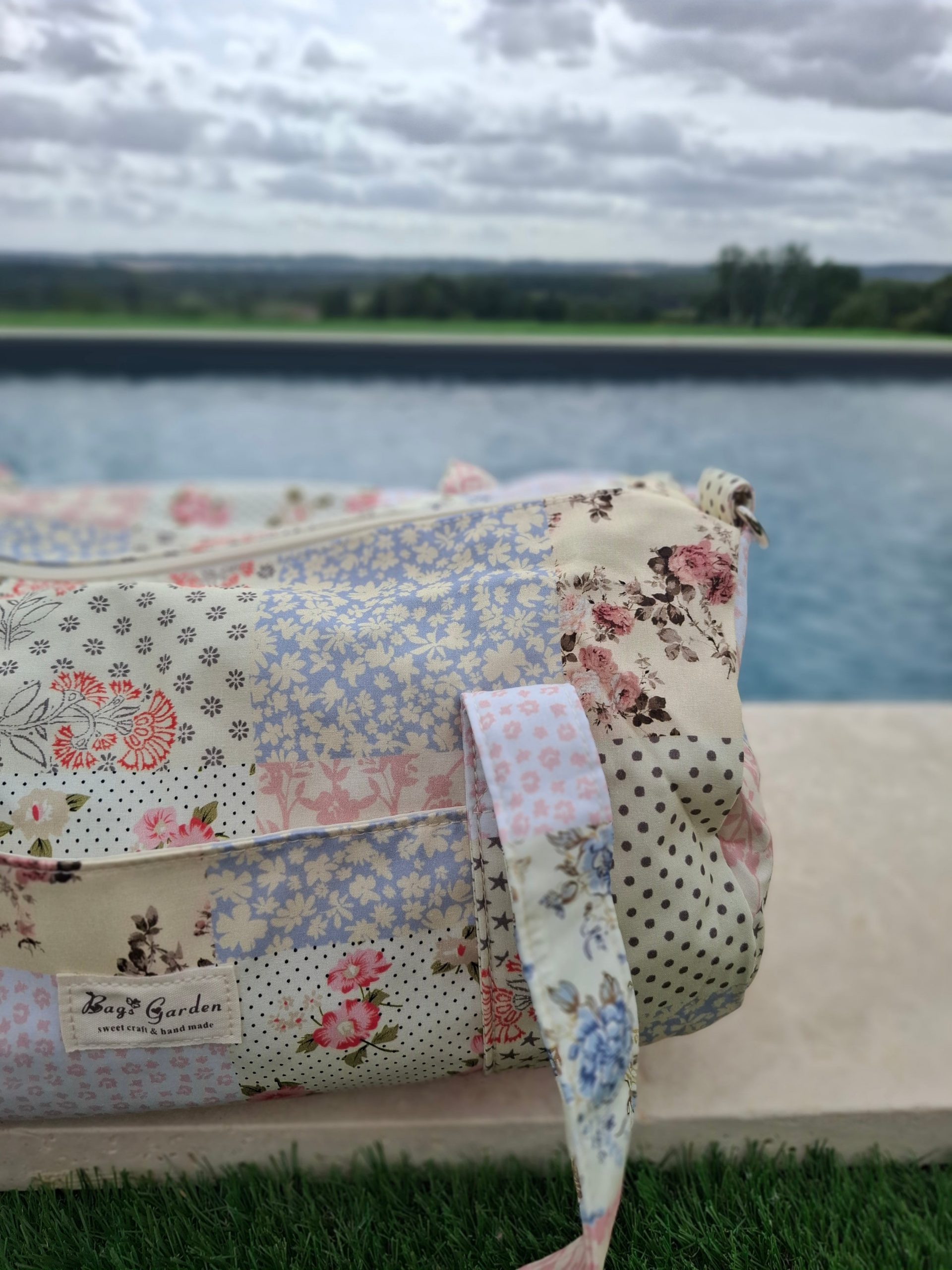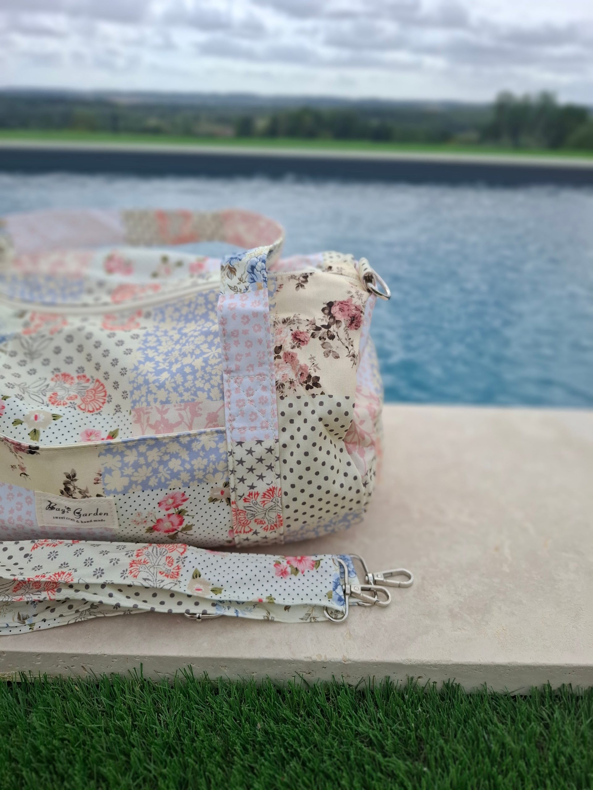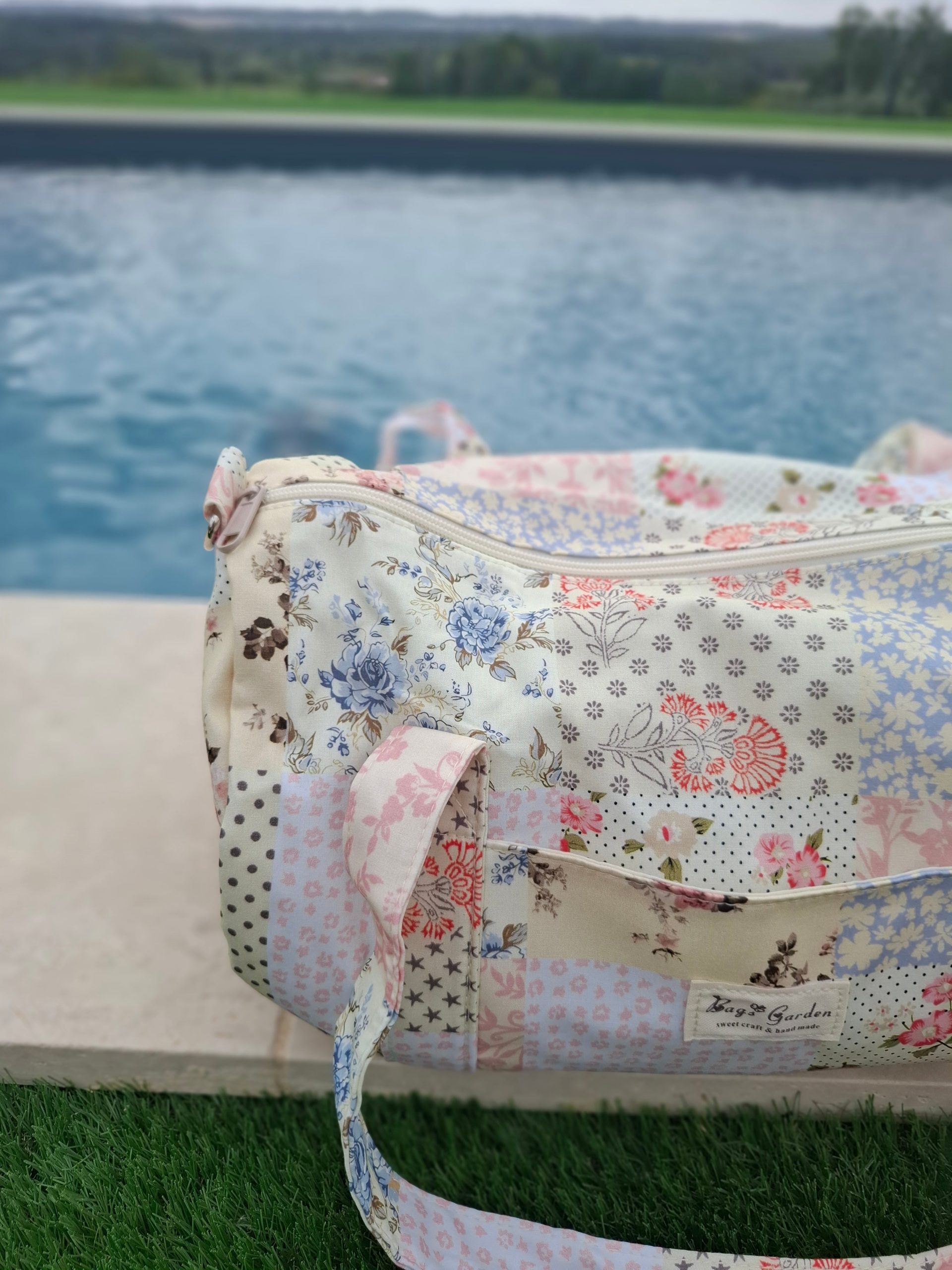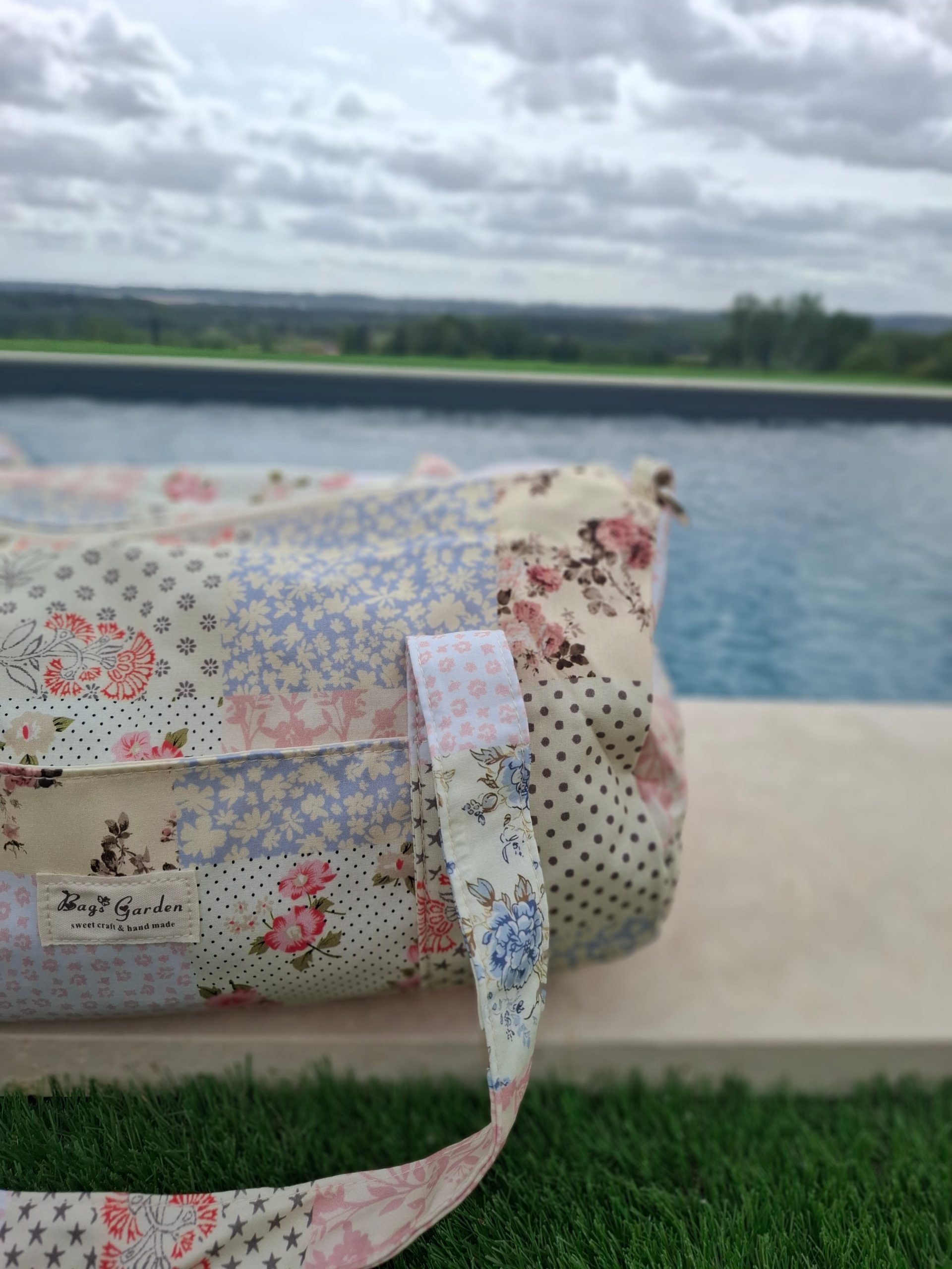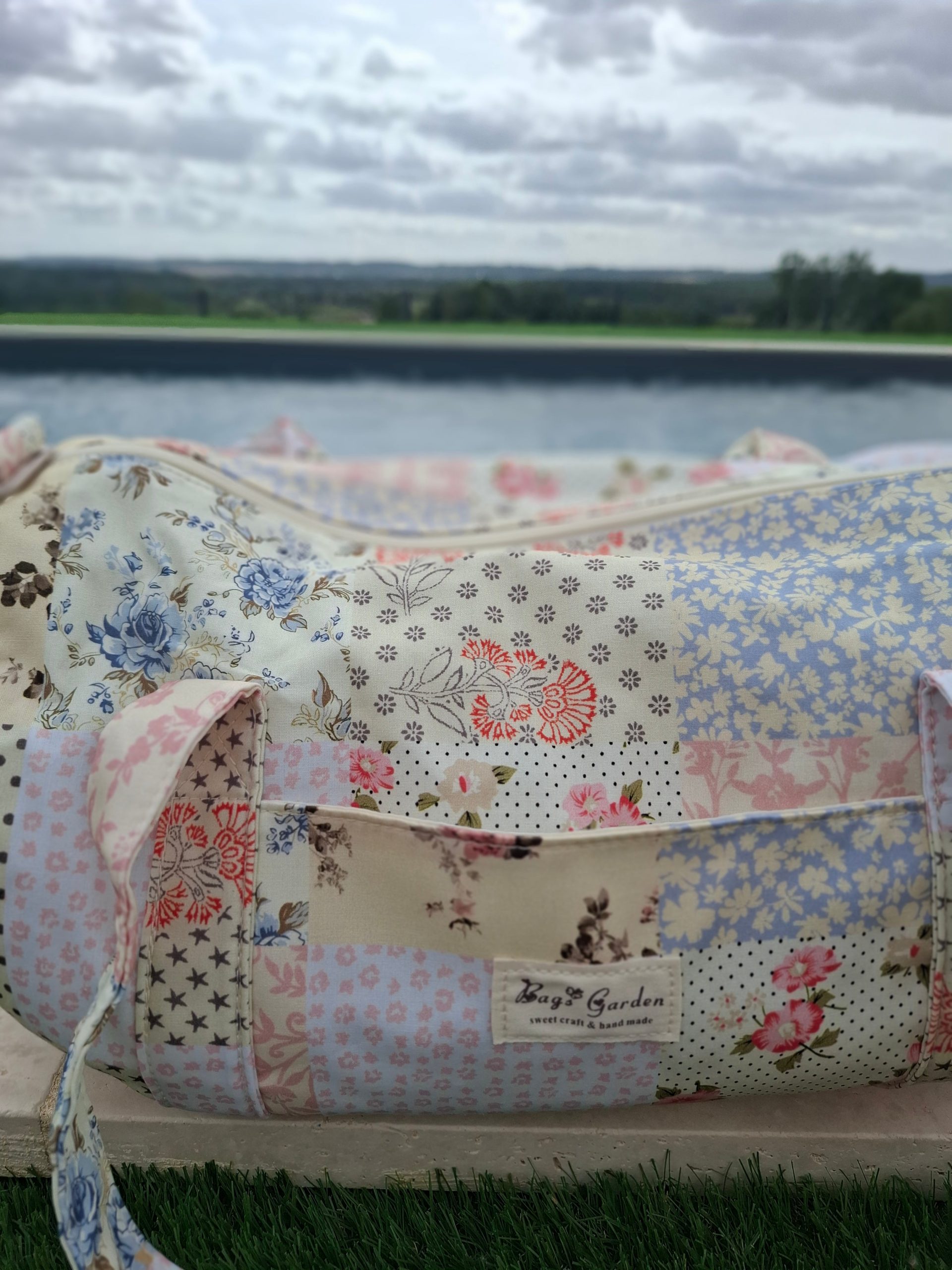 Sac polochon week end de voyage en tissu coton patchwork multicolore fleuri bleu clair orange