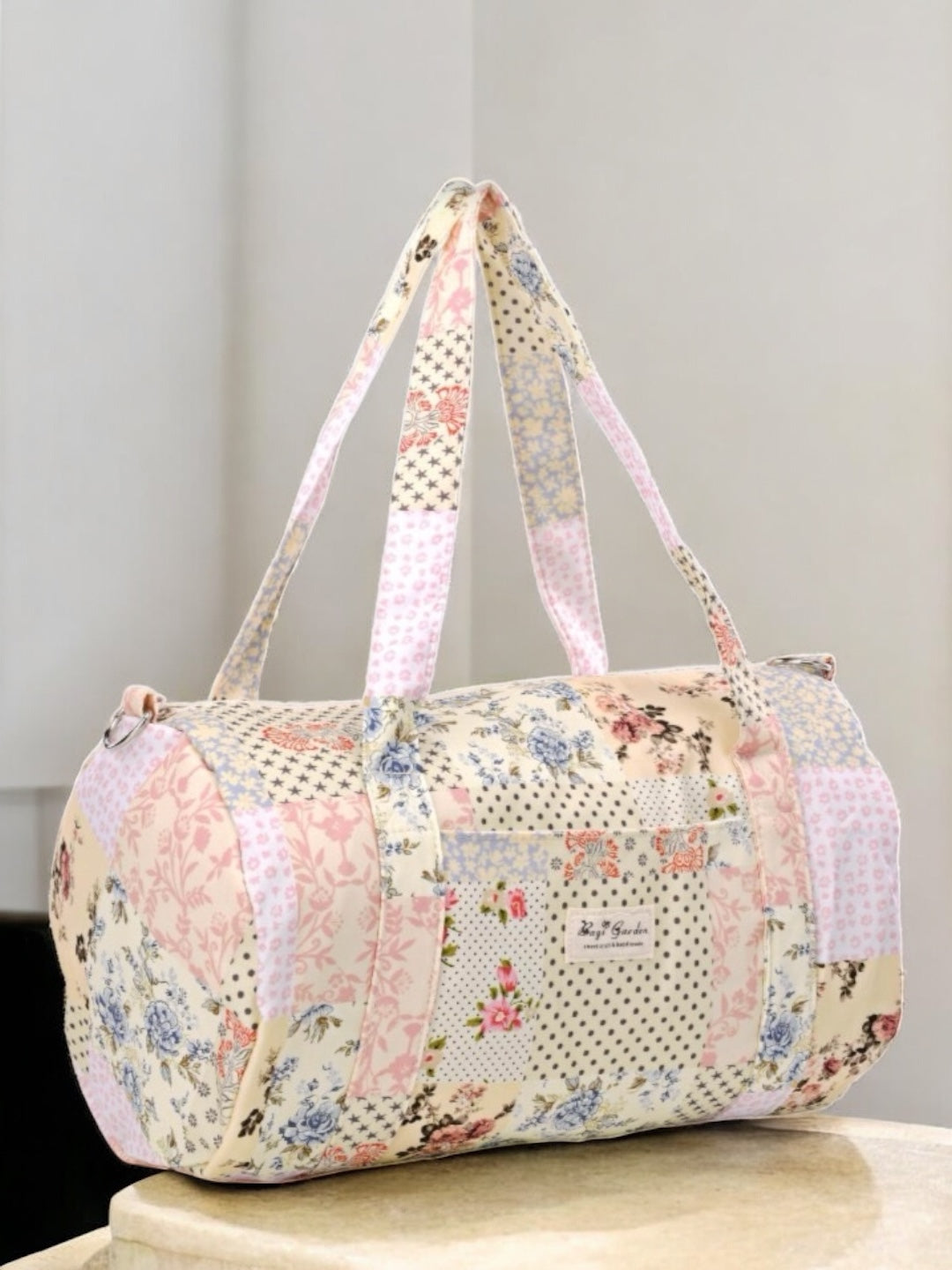 Le sac présente un design patchwork multicolore qui combine des motifs floraux et à pois. La palette de couleurs comprend des tons de bleu, rose, crème et orange. Les poignées longues facilitent le port à l’épaule. Le sac a une structure cylindrique avec des coutures visibles qui ajoutent du charme à son style artisanal.