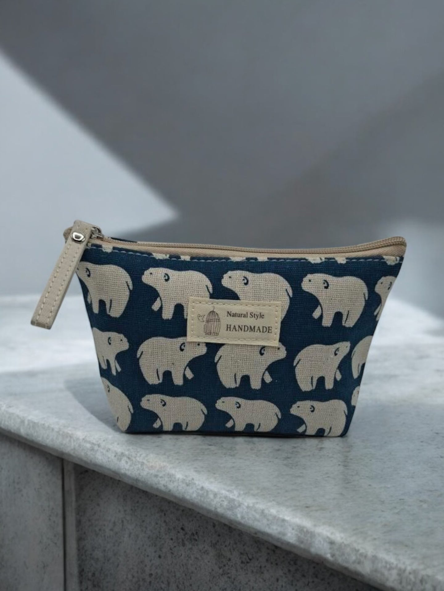 La trousse arbore un tissu gris avec un motif géométrique blanc distinctif, ajoutant une touche moderne à son allure. Elle est dotée d’une fermeture éclair pratique équipée d’un curseur en matériau blanc. Un badge sur le devant, avec l’inscription « Natural Style HANDMADE » et un petit dessin de cage à oiseau, souligne son caractère artisanal. Sa forme rectangulaire assure une bonne capacité de rangement pour divers articles personnels.